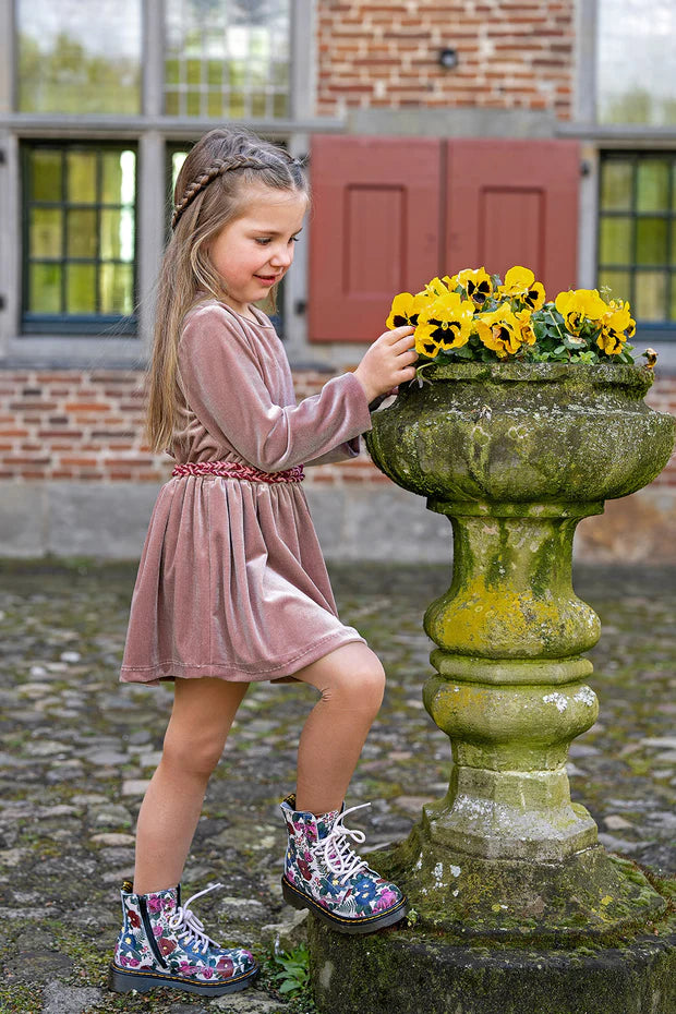 Deze fluwelen jurk van een stretch stof heeft lange mouwen en een aangerimpelde korte rok. In de nek sluit de jurk met een knoopje.