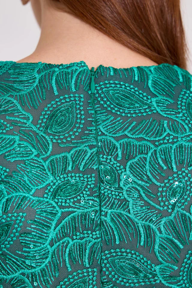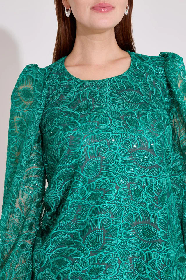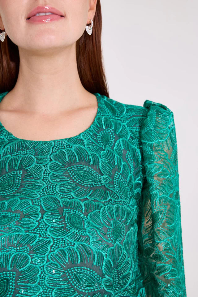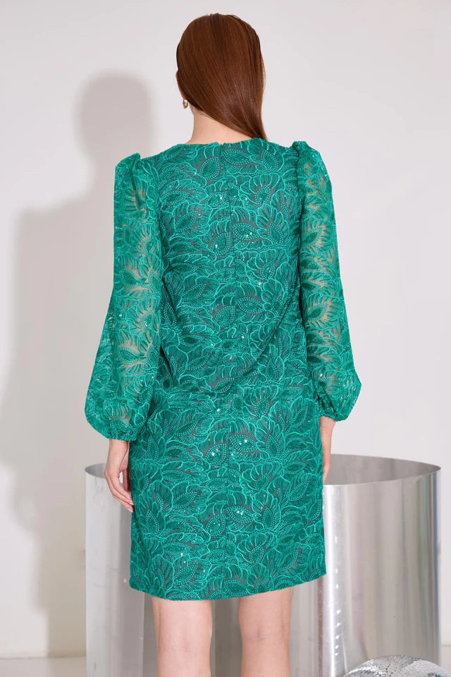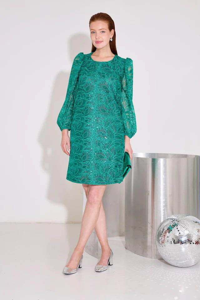Deze jurk combineert een klassiek silhouet met speelse pofmouwen en rijk geborduurd kant. De stof is iets doorschijnend. Het lijf van de jurk is gevoerd en de mouwen niet, dat zorgt voor een verfijnde uitstraling. De rechte vorm maakt ’m tijdloos chic en comfortabel.