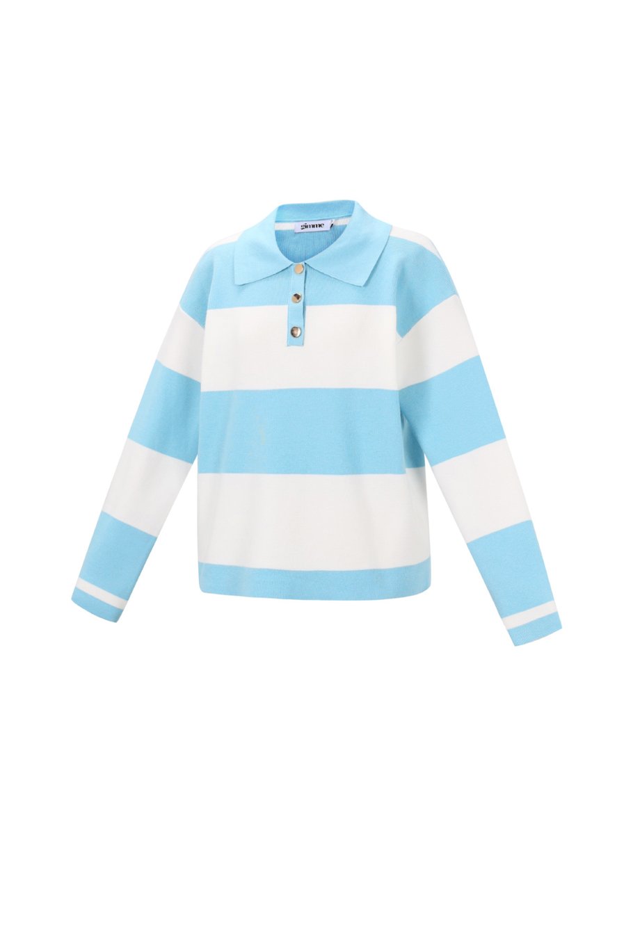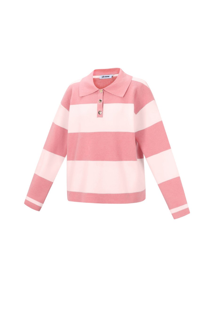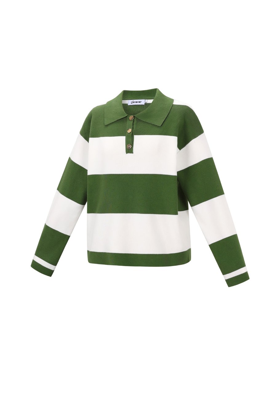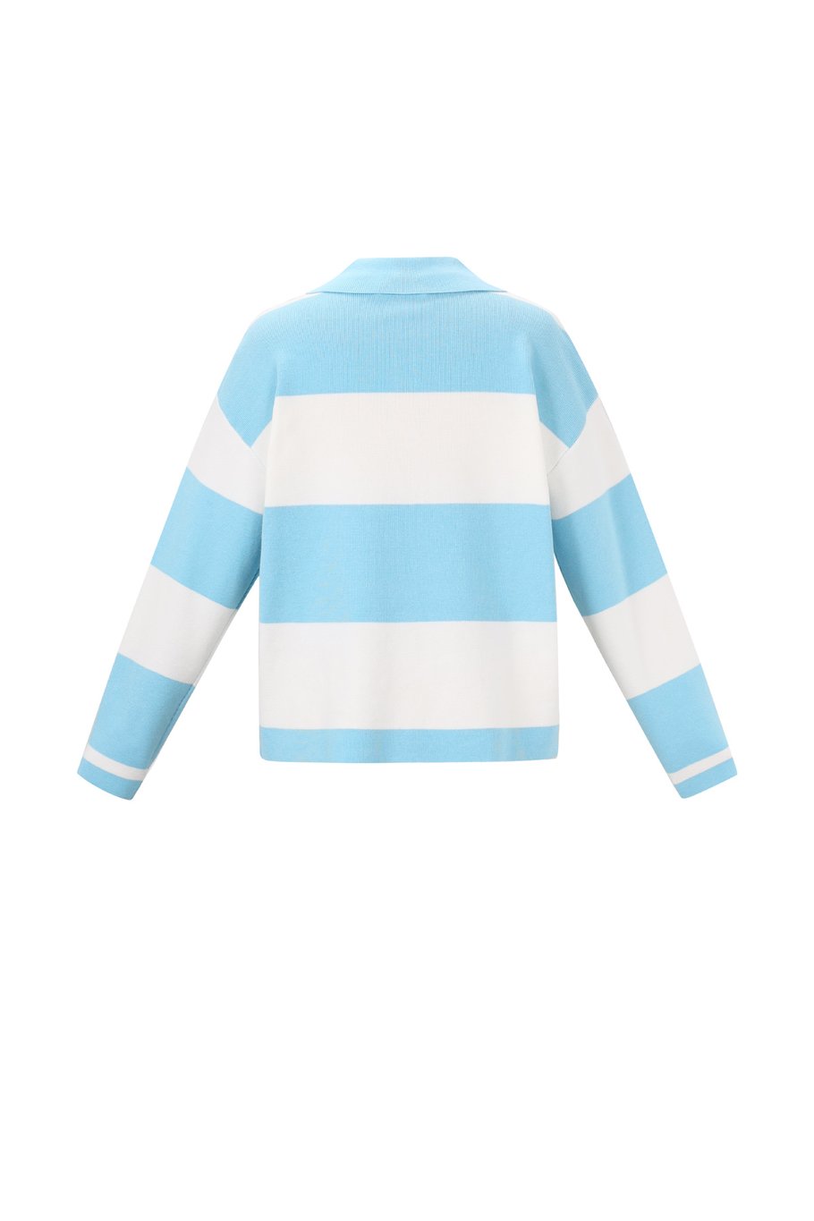 Een fijngebreide gestreepte trui met lange mouwen en polosluiting.