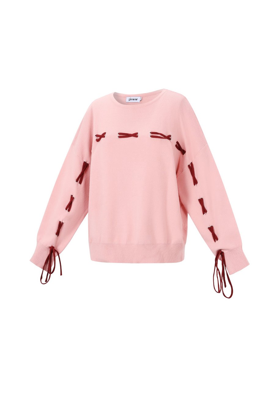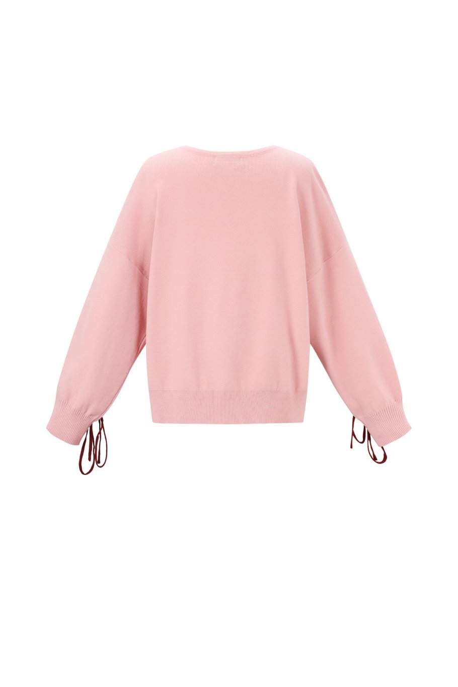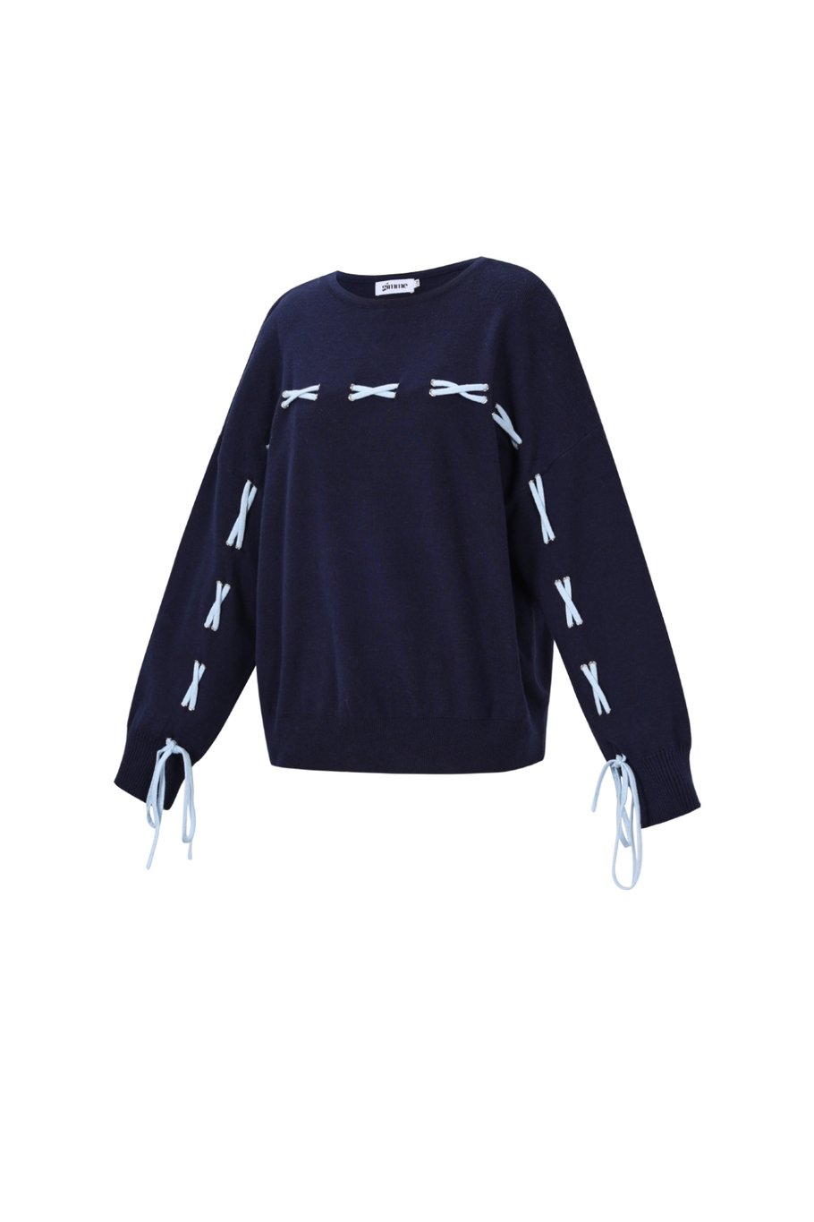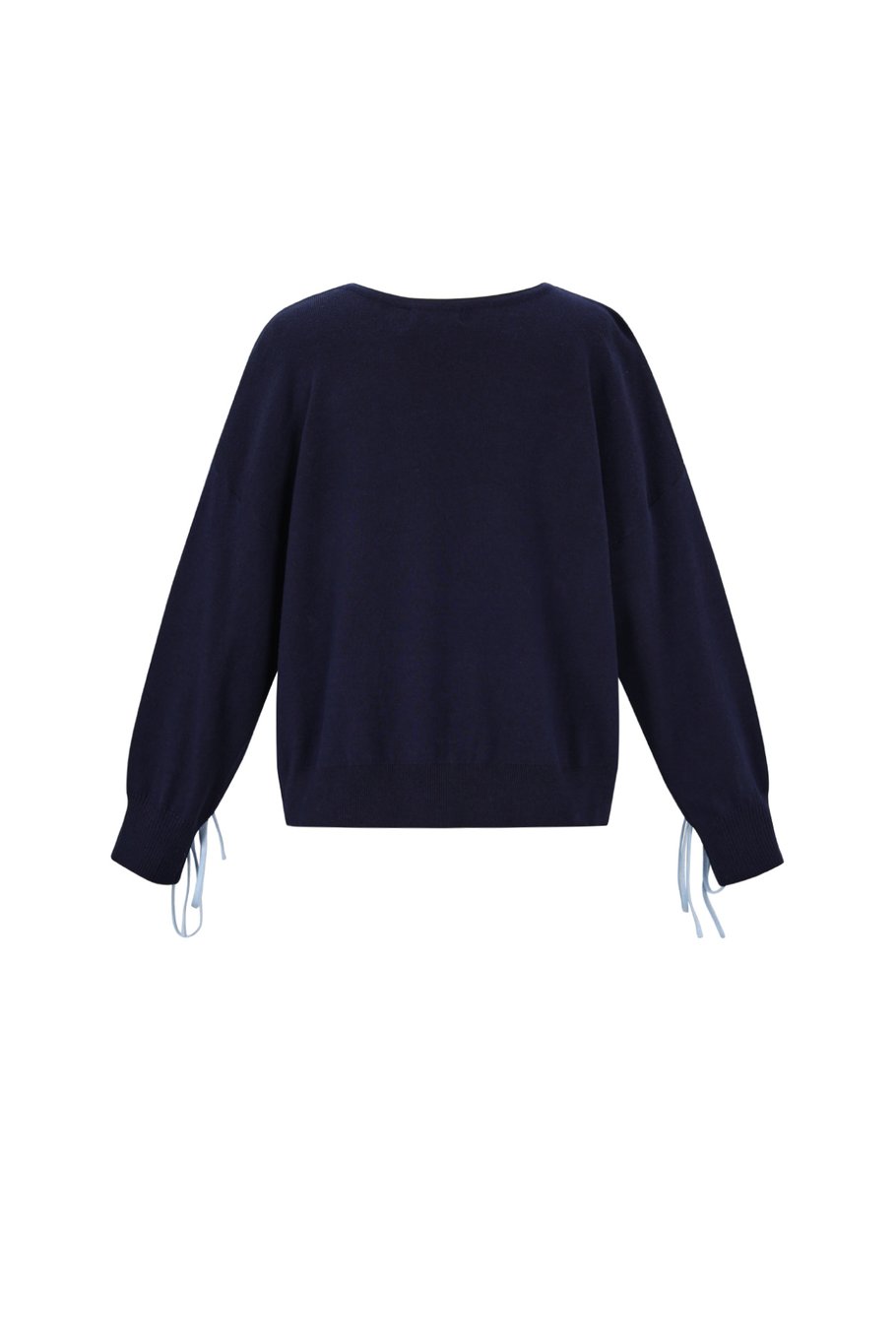 Een trui met geregen koord in afstekende kleur, van de ene mouw, over het voorpand, tot onderaan de andere mouw. De trui heeft boorden aan mouwen en heup en een ronde hals.