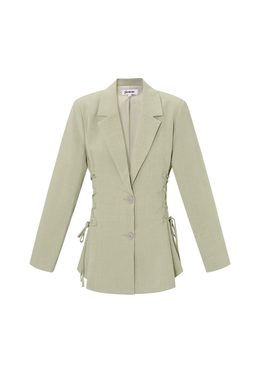 Een mooie blazer met vetersluiting in de zijnaden, waardoor de blazer getailleerd kan worden zoveel als je wenst. Verder heeft de blazer een reverskraag en een split middenachter. Aan de voorzijde sluit de blazer met knopen. Het jasje is gevoerd.