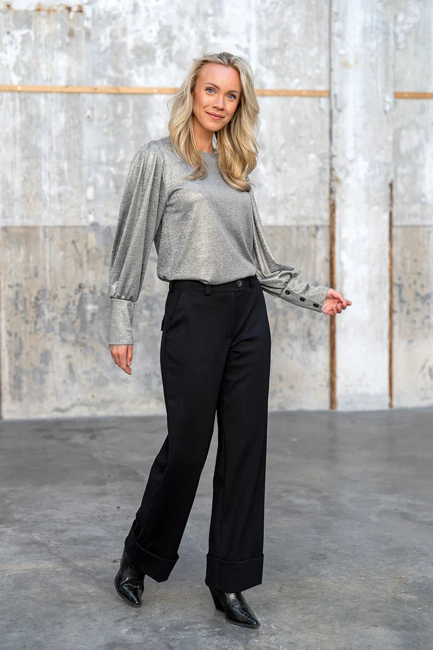 Deze schitterende blouse van een lurex jersey heeft pofmouwen met brede manchetten. Verder heeft de top een ronde hals en een knoopsluiting op het rugpand.
