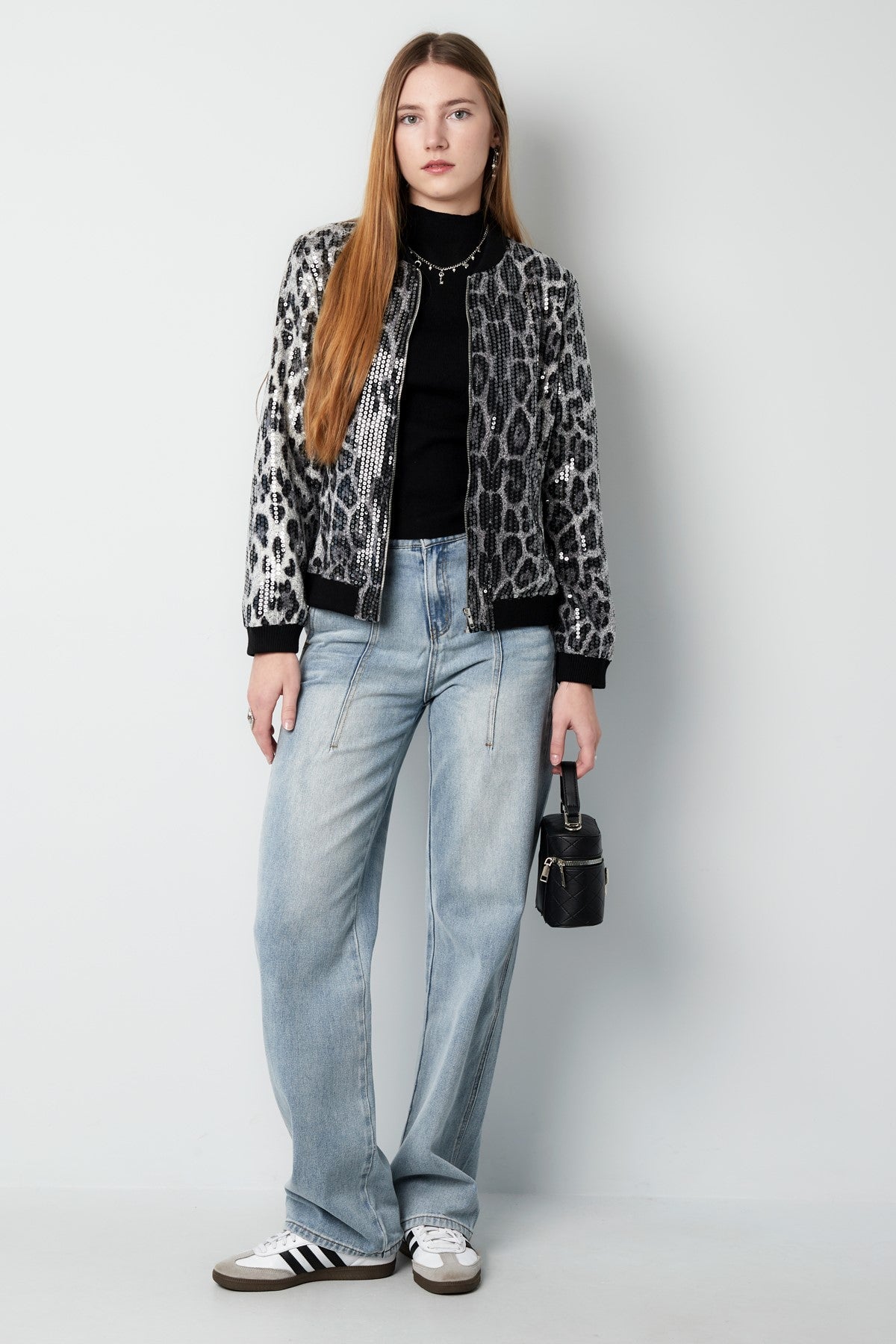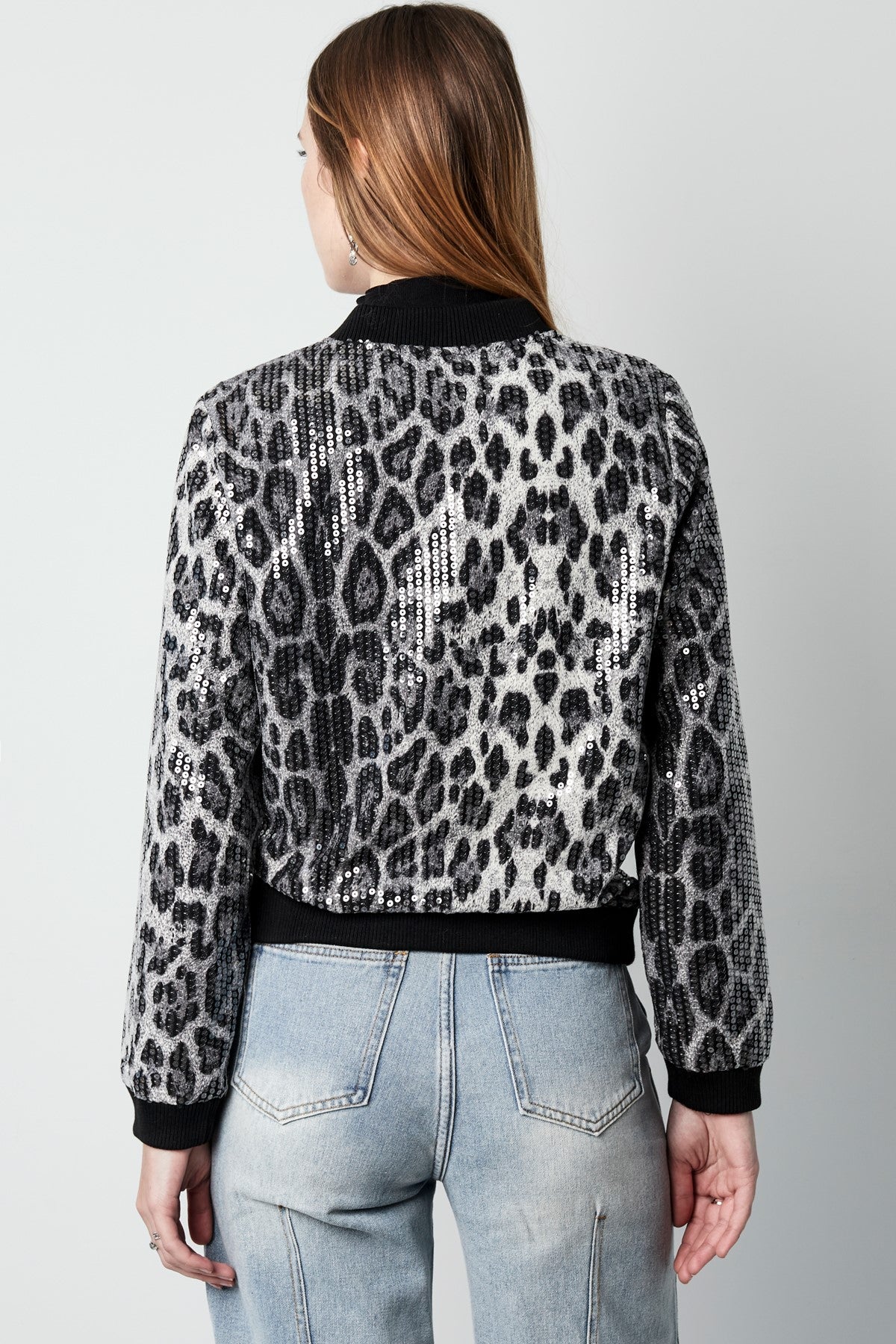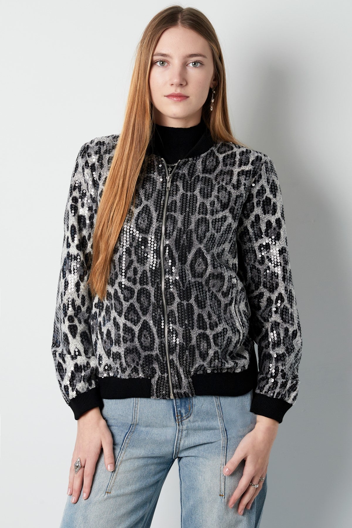 Een jasje in panterprint met coating en transparante pailletten, die voor een glitter effect zorgen. Het jack heeft lange mouwen en boorden aan hals, mouwen en panden.