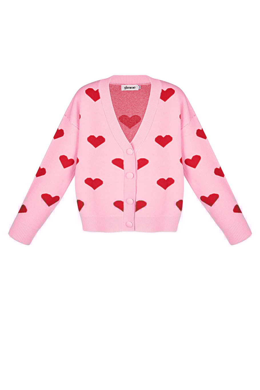 Een fijngebreid kort vest met hartjes en een knoopsluiting middenvoor. Dit vest heeft lange mouwen en boorden langs de onderkant mouwen en panden. Ook langs de hals, doorlopend tot de voorpanden.