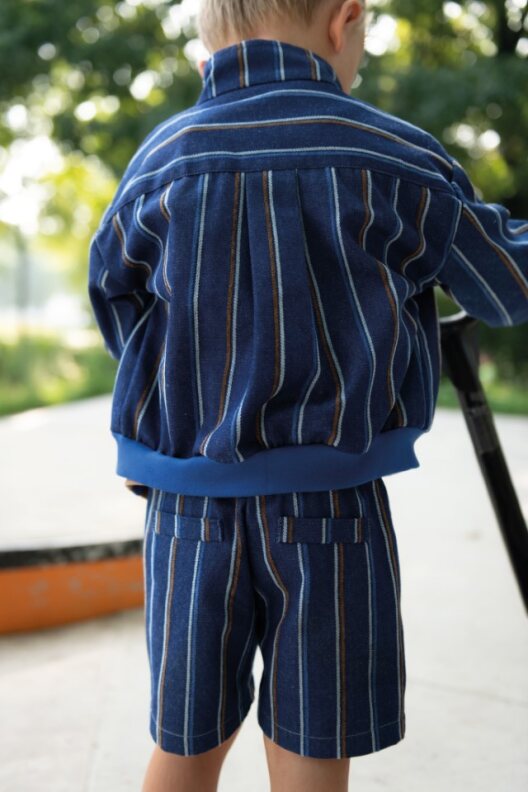 Een jongens jack van een gestreepte katoen. Op het voorpand heeft de jas opgestikte zakken en langs de hals een opstaande boord. Middenvoor een ritssluiting en onderaan een heupboord met elastiek, zo ook langs de onderkant van de mouwen.