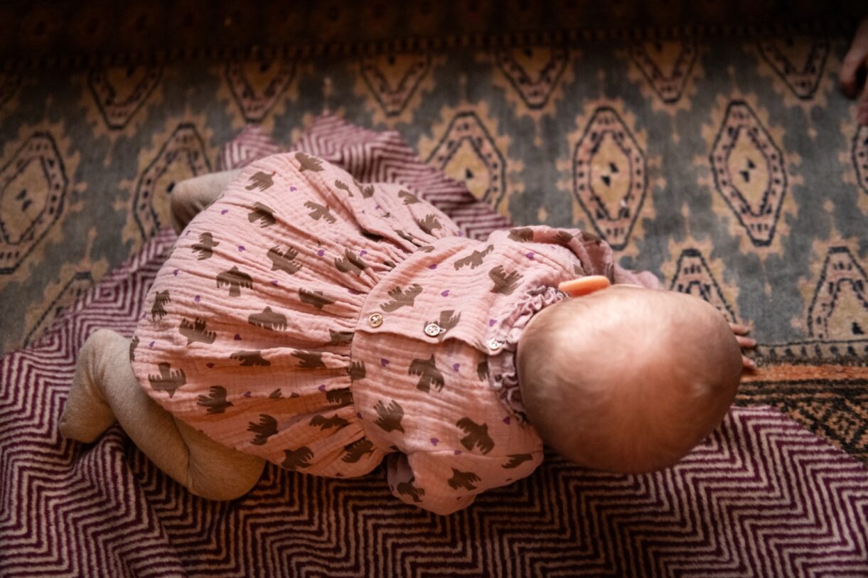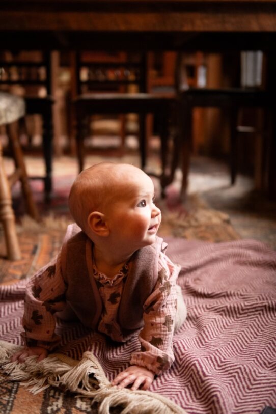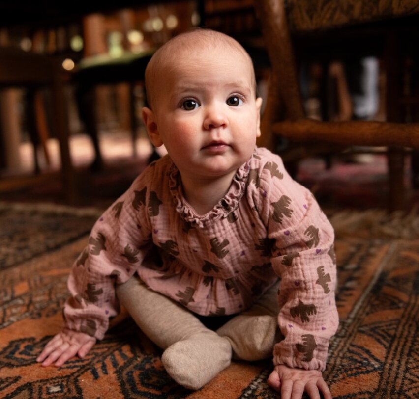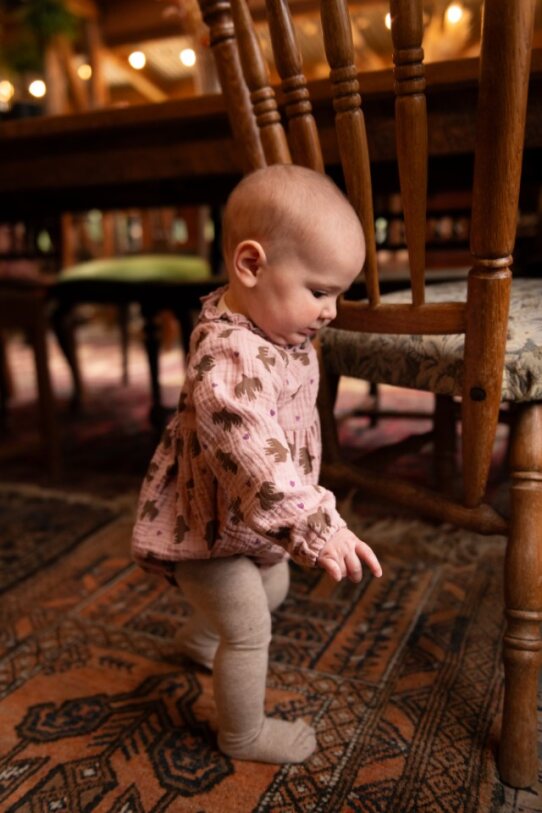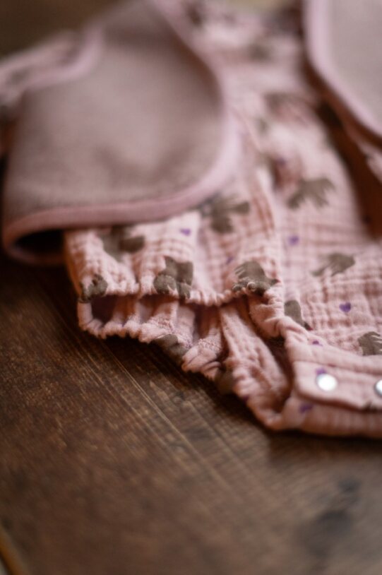 Een hydrofiel baby romper met vogel print. Deze onesie heeft lange mouwen met elastiek en een ruche langs de hals. Op het rugpand een knoopsluiting en drukkers in het kruis voor gemakkelijk verschonen.