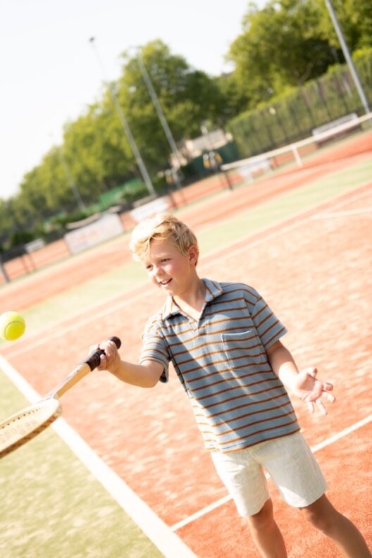 Een jongens poloshirt van een gestreepte badstof, een stof met een prettig draagcomfort. Het neemt vocht op bij warme dagen. Het shirt heeft een polosluiting met kraag, korte mouwen en een borstzak. Een goede optie voor bijvoorbeeld sportieve bezigheden.