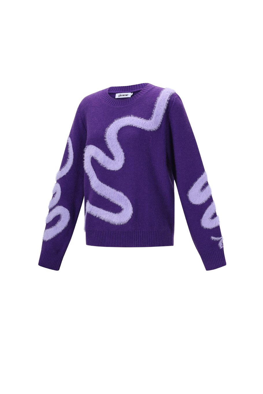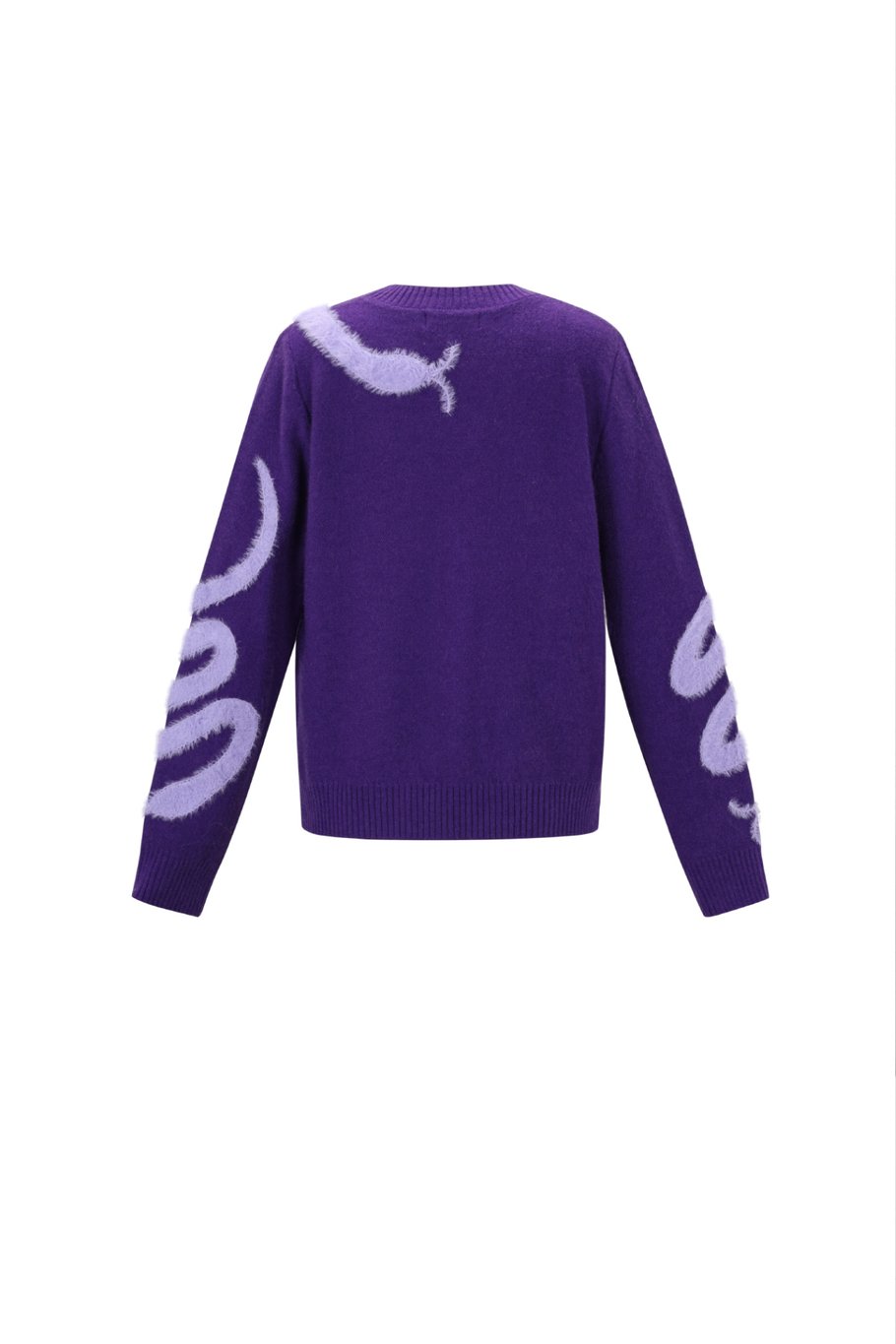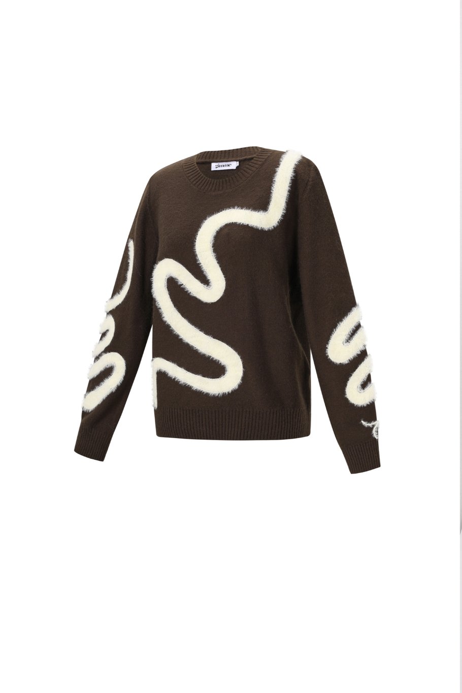 Een leuke trui met kronkels. Een eenvoudig model met ronde hals en boorden met applicatie van een zacht materiaal, wat deze trui toch heel speciaal maakt.