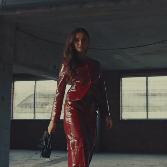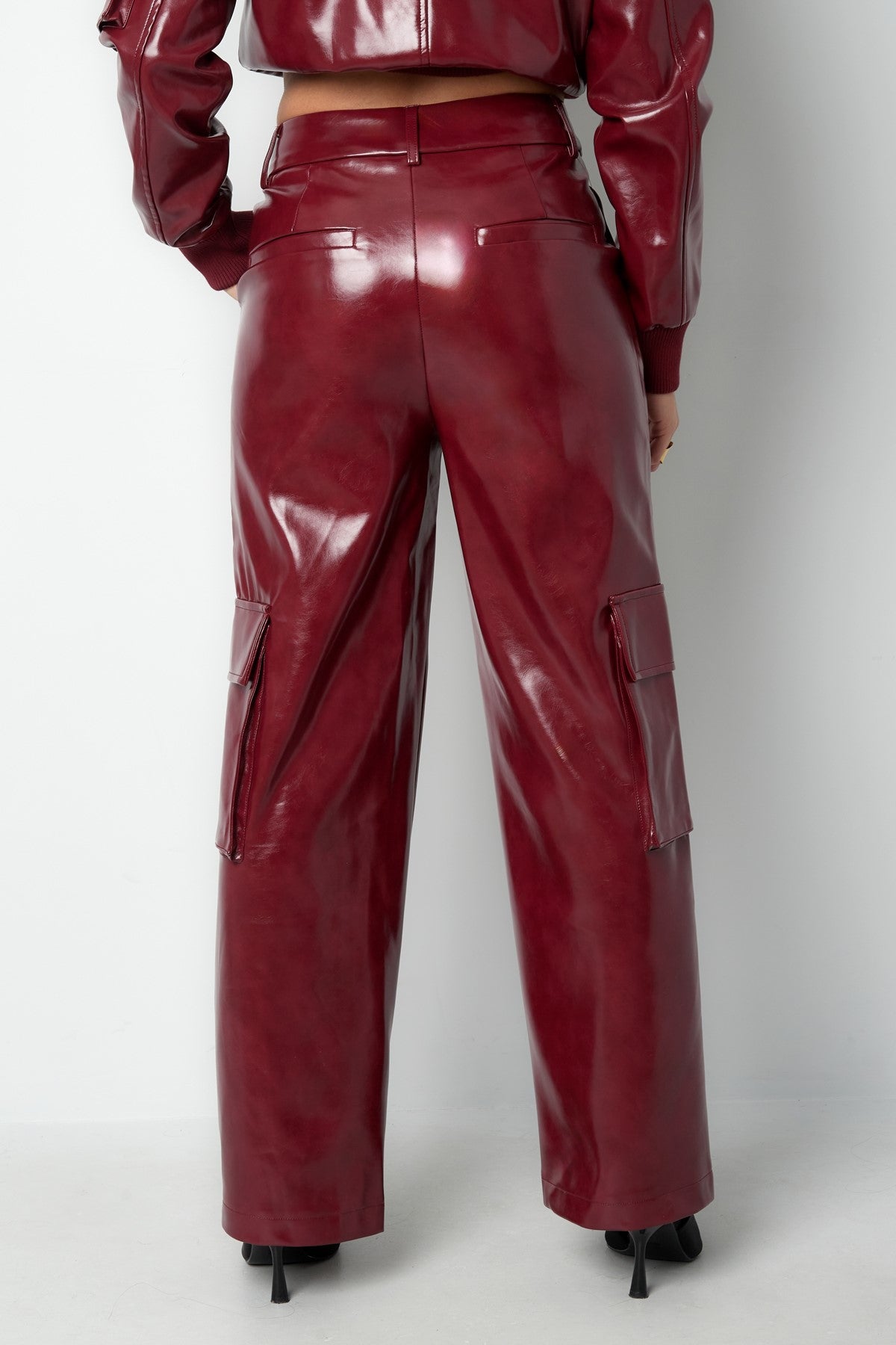 Een imitatie lederen broek in cargo model met wijde rechte pijpen en klepzakken op de zijkant benen.