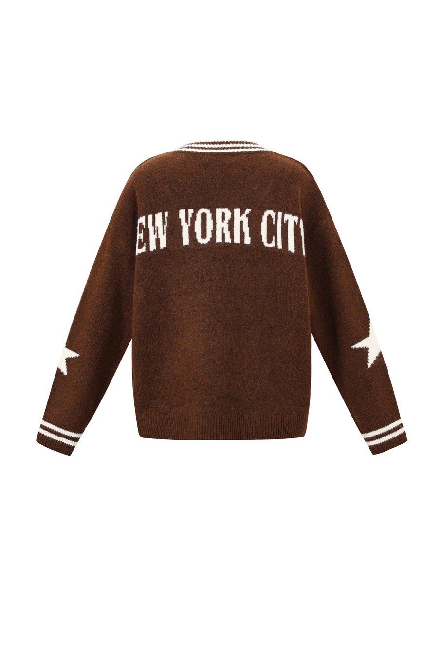 Een sportieve gebreide trui met V-hals en gestreepte boorden aan hals en mouwen. De trui heeft sterren op de mouwen, een cijfer op het voorpand en de tekst New York City op het achterpand.