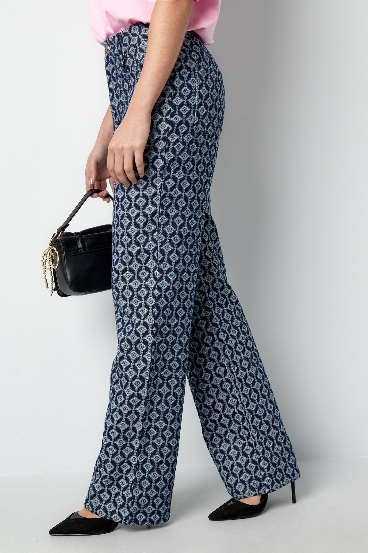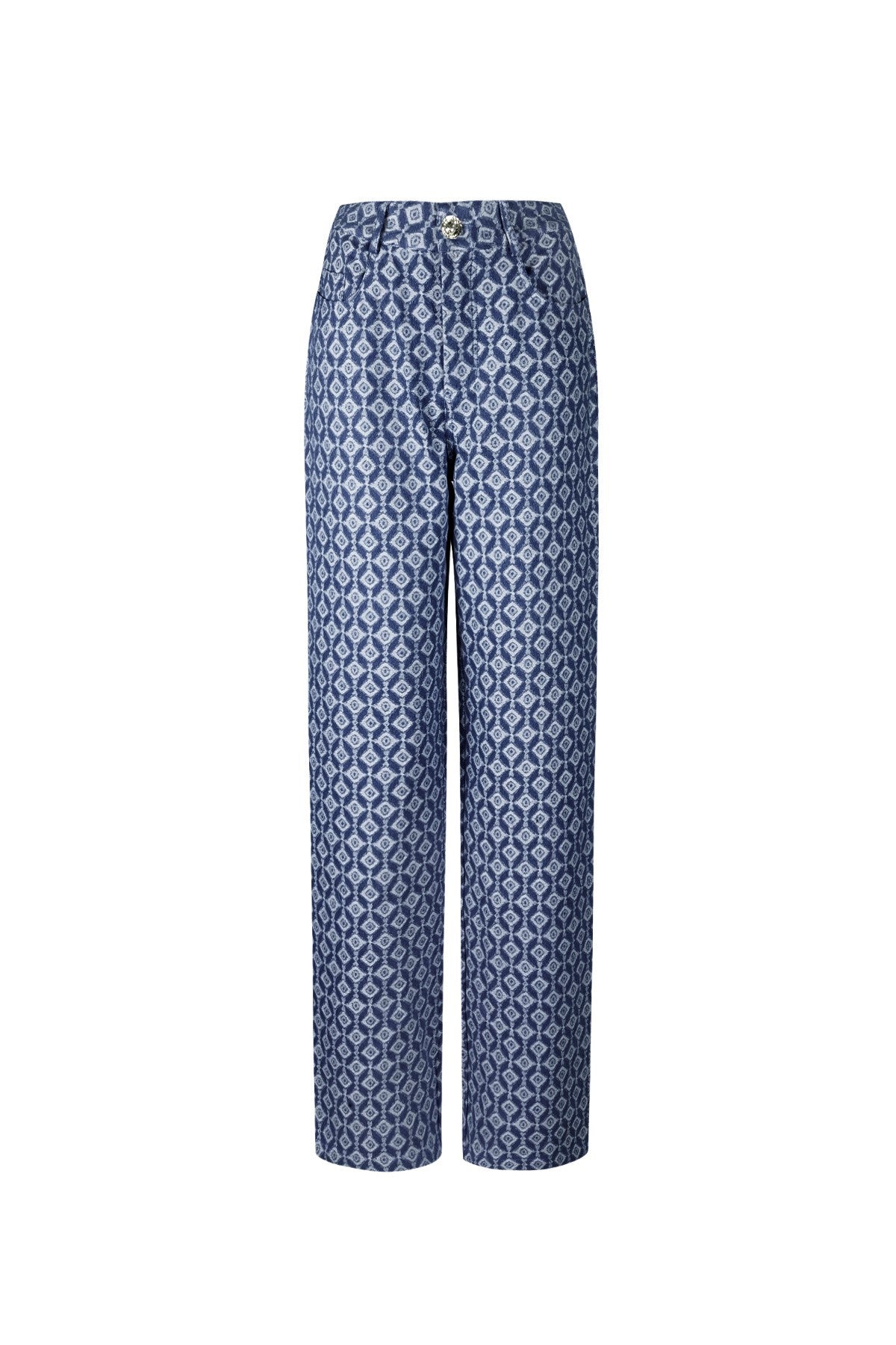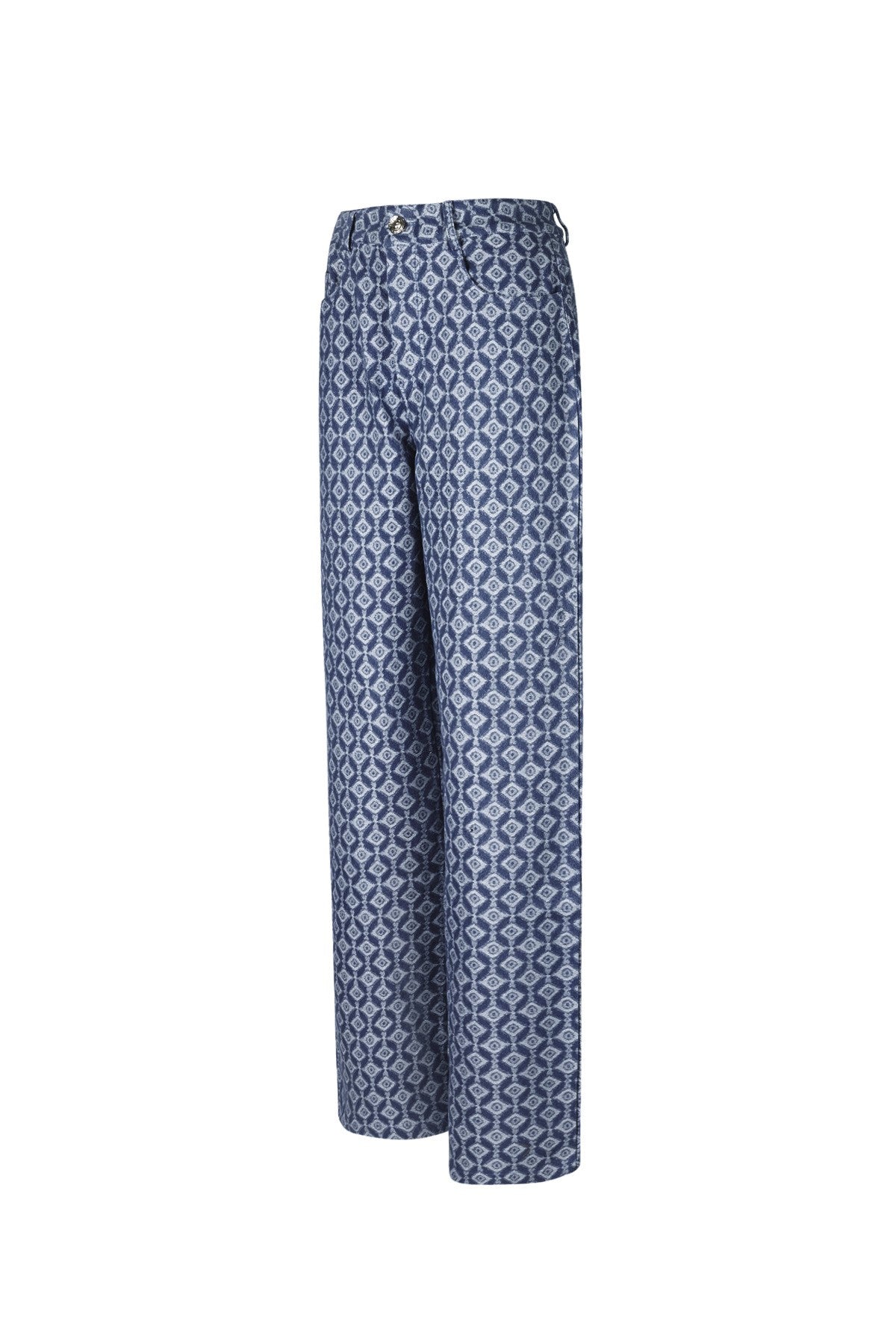 Dames spijkerbroek met steek- en achterzakken in een jacquard ruit motief.